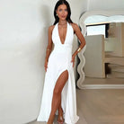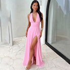 هذا الفستان الطويل يتميز بقصة صدر عميقة وخصر مرتفع، مما يبرز قوامك. الشق الجريء والرباط الدقيق يضيفان لمسة من الرقي. مثالي للمناسبات الأنيقة والاحتفالات الخاصة.