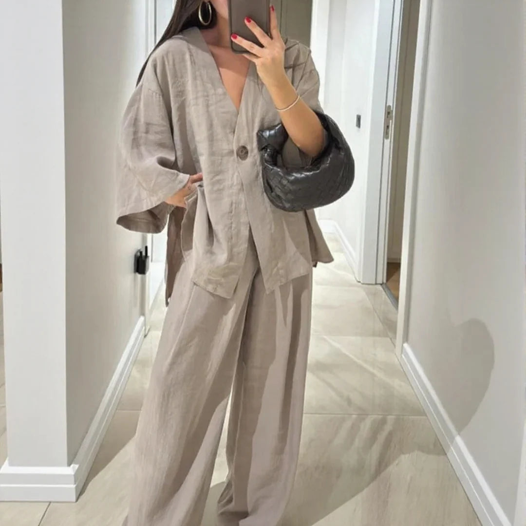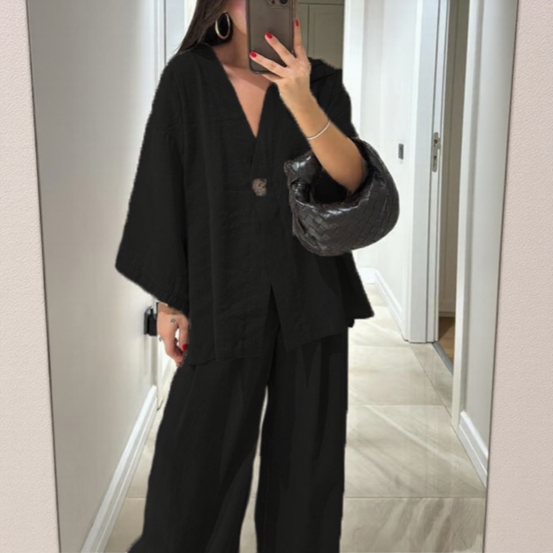تجمع هذه المجموعة بين بلوزة فضفاضة وسروال واسع لتكوين قوام أنيق. مصممة لتوفير حرية حركة مثالية، فهي مثالية للأيام الحارة. مثالية للخروج غير الرسمي أو لحظات الاسترخاء في المنزل.