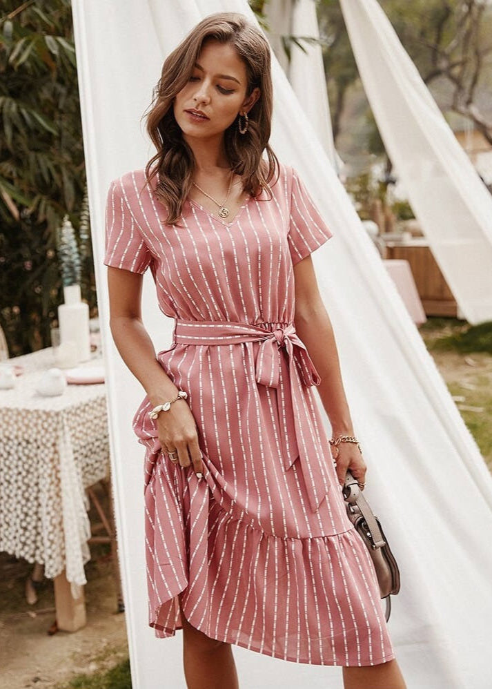 تجذب هذه الفستان المخطط عمودياً بقصتها السائلة وتصميمها النظيف. يضيف ياقة على شكل V وأكمام قصيرة لمسة أنثوية. مثالية لأيام الصيف أو الأمسيات بكل بساطة.