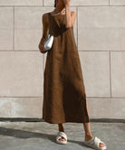 يجذب هذا الفستان الطويل بأسلوبه البسيط وسقوطه السلس الذي يبرز القوام بشكل طبيعي. قصته النظيفة والشقوق الجانبية الخفية تجعله قطعة مثالية لدمج الراحة والرفاهية. خفيف ومريح للارتداء، يتناسب مع الأيام المشمسة وكذلك لحظات الاسترخاء في العطلات.