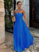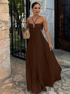 Tato dlouhá bezrukávová šaty mají plisovaný korzetový design s krkem a křížením na zádech. Ideální pro horké dny, spojuje pohodlí a styl. Jejich neformální vzhled je ideální volbou pro různé letní příležitosti.