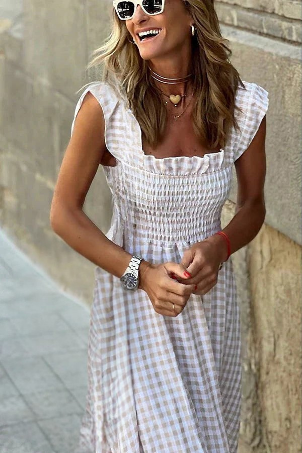 Mit ihrem zeitlosen Karomuster und der gerafften Taille betont dieses Kleid die Silhouette mit Eleganz. Der fließende Schnitt sorgt für optimalen Komfort, ideal sowohl für den Alltag als auch für festlichere Anlässe. Ein perfektes Gleichgewicht zwischen Stil und Leichtigkeit.