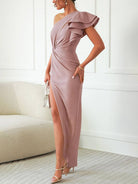 Αυτή η μακριά φόρεμα έχει ρευστή γραμμή με γυμνό ώμο. Οι επάλληλες φούστες και η πλαϊνή σχισμή προσθέτουν μια πινελιά κομψότητας. Ιδανικό για γάμους, βραδιές και άλλες επίσημες περιστάσεις.