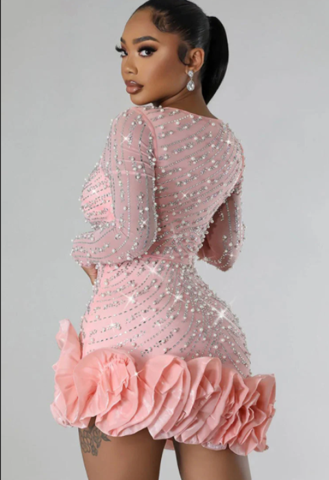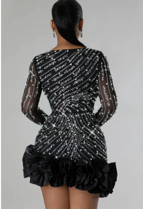 Αυτή η μίνι φόρεμα είναι διακοσμημένη με λαμπερούς κρυστάλλους. Ο βαθύς V-λαιμός της και τα μακριά, εφαρμοστά μανίκια προσφέρουν μια κομψή σιλουέτα. Ιδανική για βραδιές και ειδικές εκδηλώσεις.