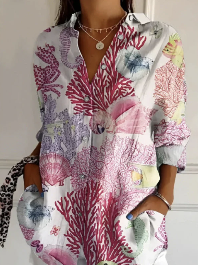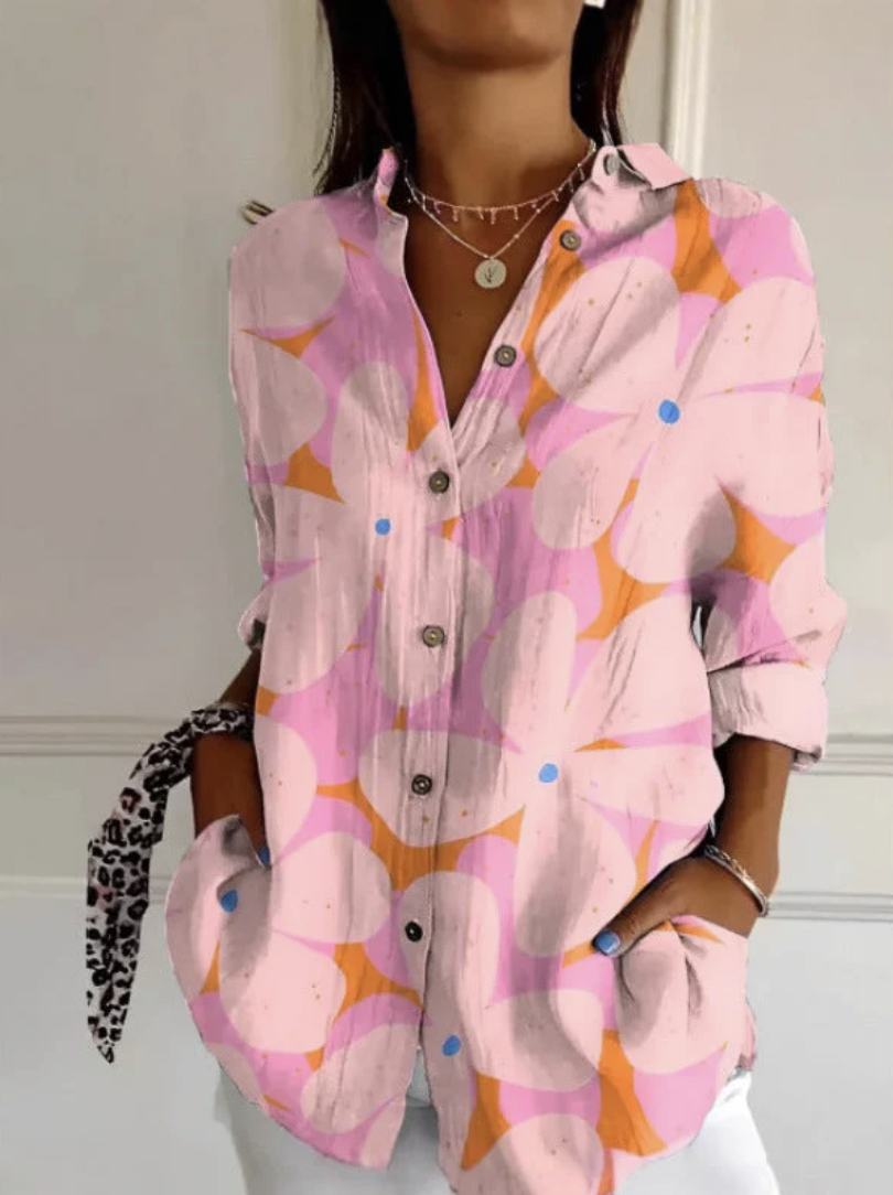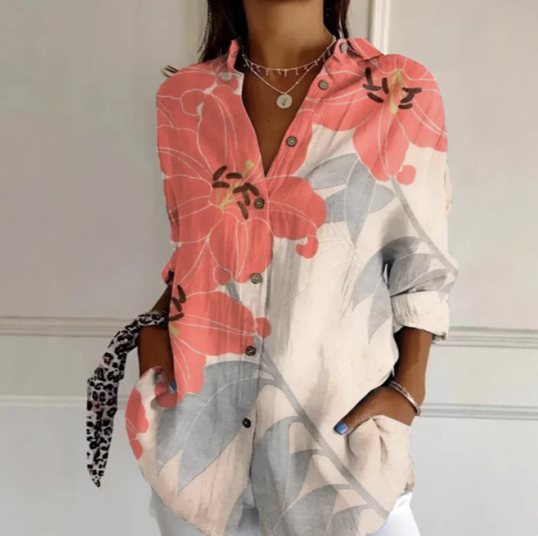 Αυτή η ρευστή μπλούζα ξεχωρίζει για την καλλιτεχνική της εκτύπωση και την αέρινη γραμμή της που αγκαλιάζει απαλά τις κινήσεις σας. Ιδανική για ηλιόλουστες μέρες ή χαλαρές εξόδους, συνδυάζει άνεση και πρωτοτυπία με διακριτικότητα. Το μποέμικο chic στυλ της προσαρμόζεται σε όλες τις επιθυμίες σας.