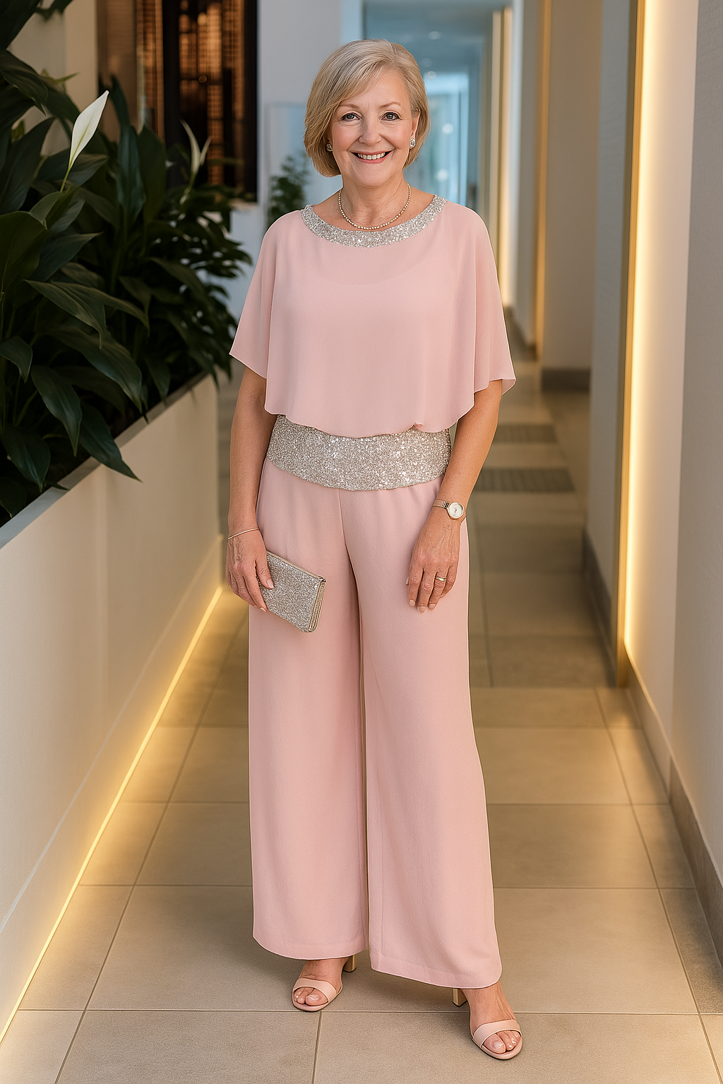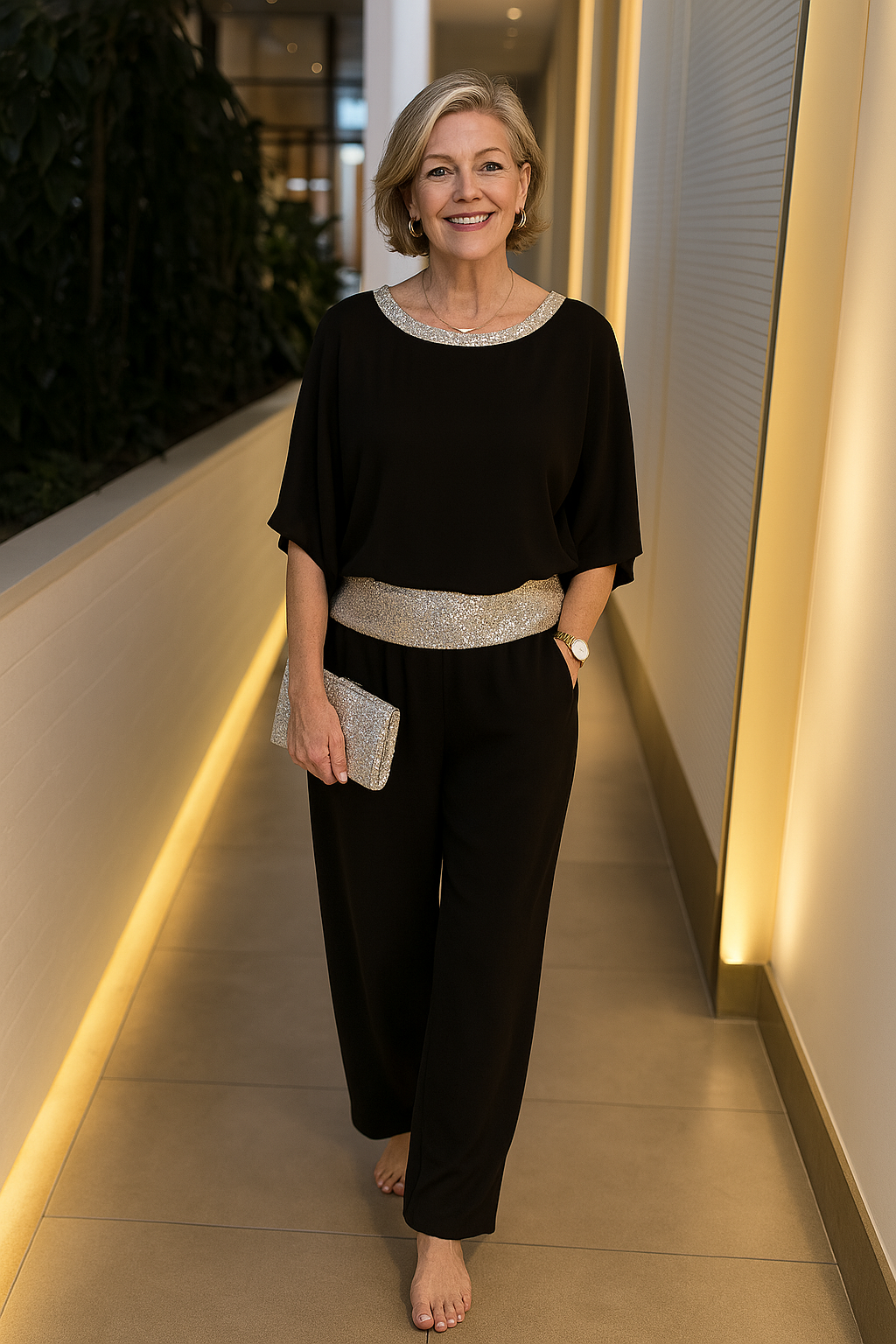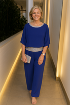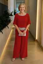 Αυτό το κομψό σύνολο για γυναίκες συνδυάζει την κομψότητα και την ευελιξία στην καθημερινότητα. Αποτελείται από ένα ρέον παντελόνι με κομψή γραμμή και μια μπλούζα με προσεγμένες λεπτομέρειες. Ιδανικό για επίσημες περιστάσεις καθώς και για πιο χαλαρές εξόδους.