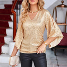 Tämä pusero korostaa siluettia hienostuneella V-päällä ja kauniisti laskeutuvilla leveillä hihoilla. Kimaltavat paljetit tuovat hienovaraisen glamourin vivahteen asuusi. Ihanteellinen iltatilaisuuksiin tai erityisiin tapahtumiin, se yhdistää tyylin ja täydellisen mukavuuden.