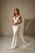 לילה | שמלת כלה ארוכה עם מחשוף בצורת V ללא שרוולים וזנב