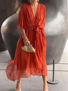 השמלה האמצעית הזו מדגישה את הסילואט בקלילות. הנפילה הטבעית שלה מבטיחה נוחות מוחלטת תוך כדי הוספת נגיעה אלגנטית ונינוחה. אידיאלית לימים שטופי שמש או לערבים מפוארים.