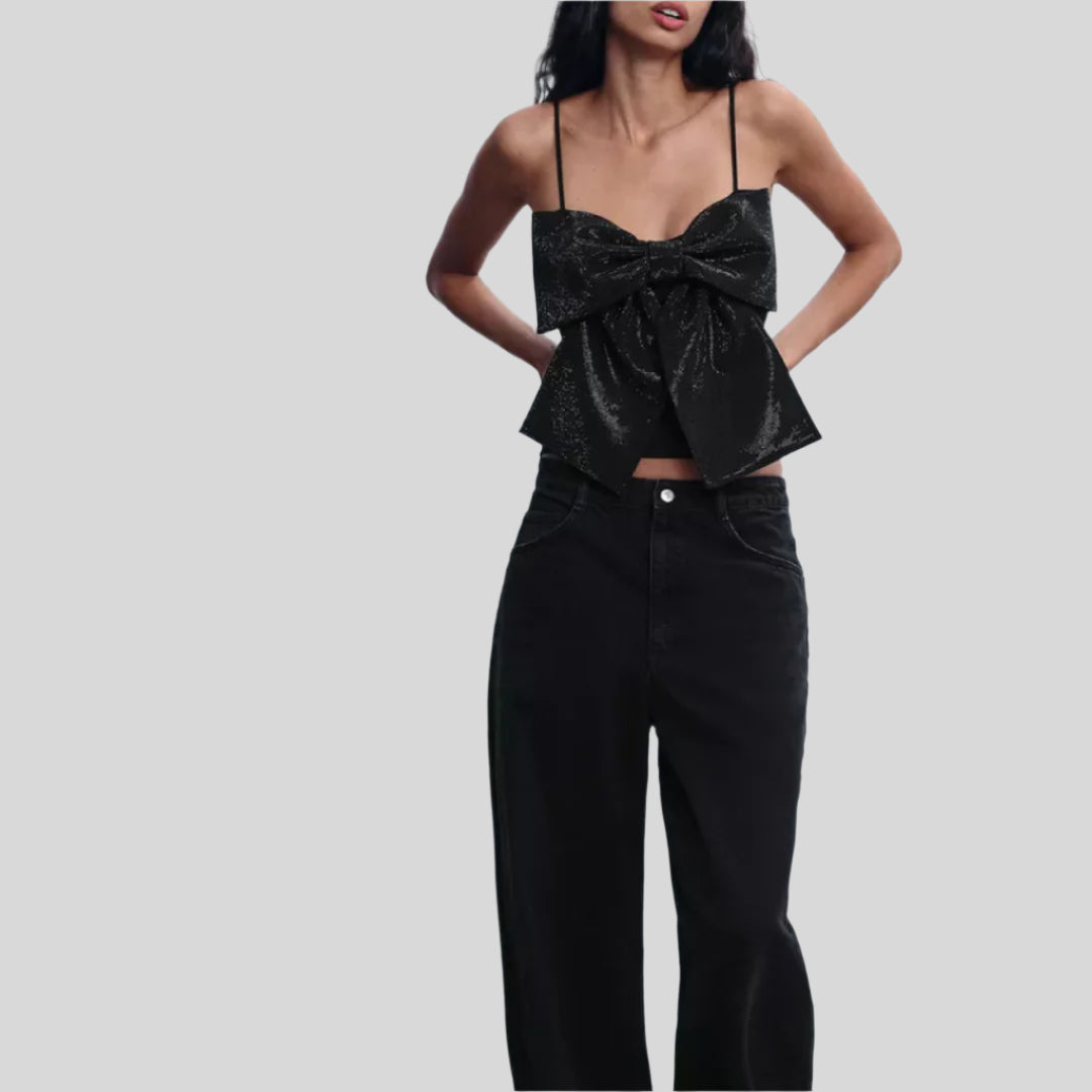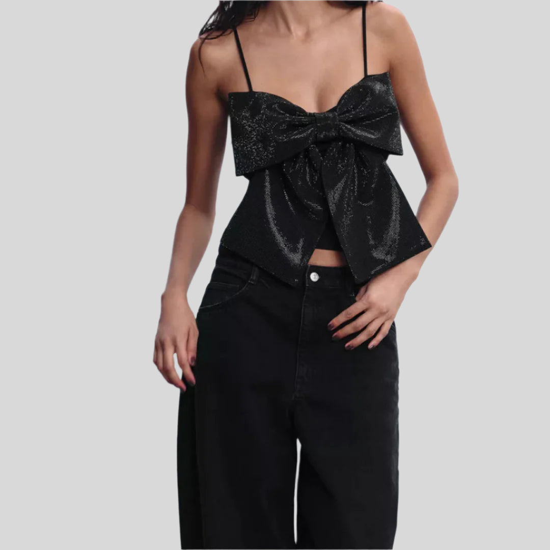 Ez a elegáns felső csillogó dizájnnal rendelkezik, amelyet egy jellegzetes masni díszít. Tökéletes különleges alkalmakra vagy hogy egy kis kifinomultságot csempésszen a mindennapi öltözetébe. Több méretben elérhető, hogy minden alkatnak megfeleljen.