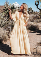 Questo vestito lungo e fluido offre una vestibilità ampia e leggera. Il suo scollo profondo mette in risalto la silhouette. Perfetto per le giornate estive o per le serate eleganti.