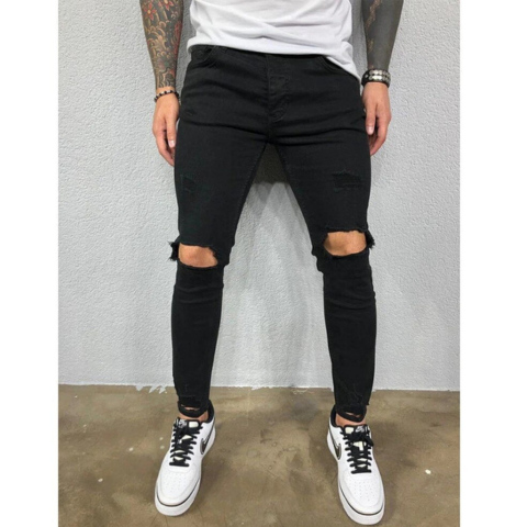 Questi pantaloni strappati offrono una vestibilità moderna e aderente. Disponibili in blu e nero, si adattano facilmente a tutti i tuoi outfit. Perfetti per un look casual e alla moda.
