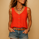 このVネックのノースリーブトップは、ゆったりとした快適なシルエットを提供します。複数の色で利用可能で、あらゆるコーディネートに合わせることができます。暑い日には最適で、スタイルと快適さを兼ね備えています。