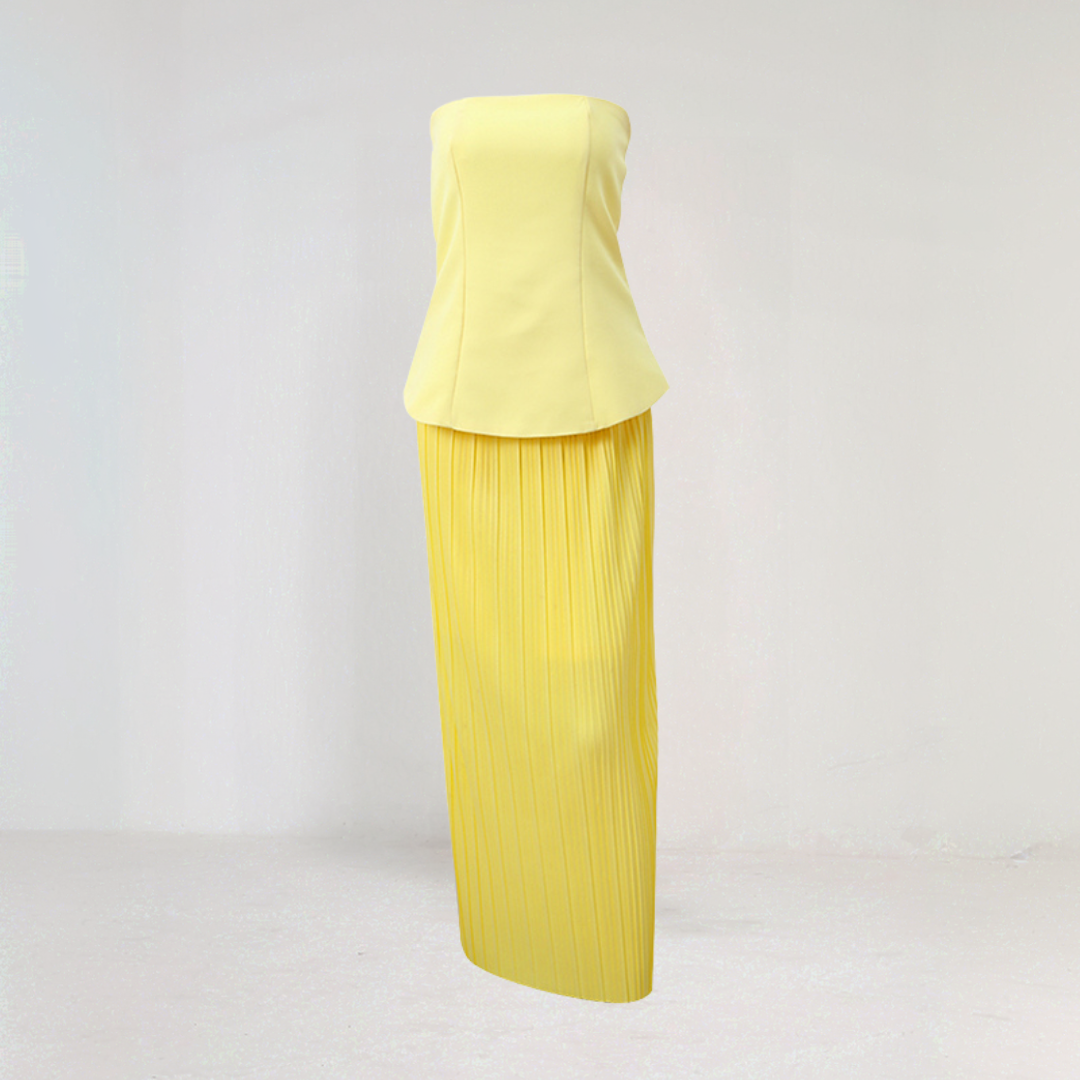 このセットは、肩を引き立てるストラップレスのクロップトップと、流れるような落ち感のあるプリーツロングスカートを組み合わせています。エレガントな場面に最適で、現代的な洗練さと一日中の快適さを兼ね備えています。