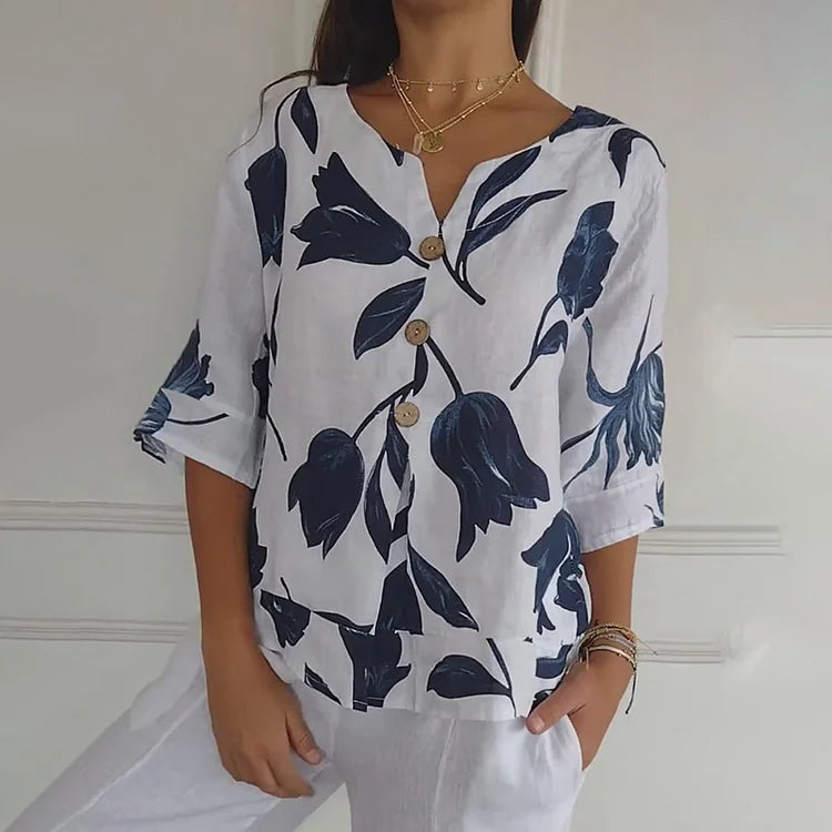 ジャンヌ | エレガントなフローラルブラウス – 中央ボタンとショートスリーブ