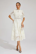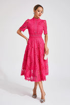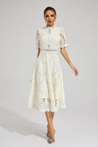 このドレスは繊細なアクセントとフラatteringなミディシルエットを持っています。結婚式、ガーデンパーティー、親しい夜に最適です。控えめなグラマーの本質を体現しています。