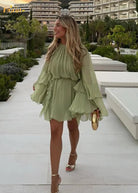 このエレガントな長袖ドレスは、ボタン付きのデコルテとサイドの繊細なフリルによって魅了します。柔らかな色合いは、夏の季節にぴったりの新鮮さをもたらし、軽やかさとボヘミアンな魅力を兼ね備えています。
