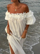 このロングドレスは、魅力的なシルエットと最適な快適さを提供します。肩を露出させた洗練されたデザインと繊細なフリルが女性らしさを引き立てます。ビーチでの昼間やカジュアルな夜にぴったりです。