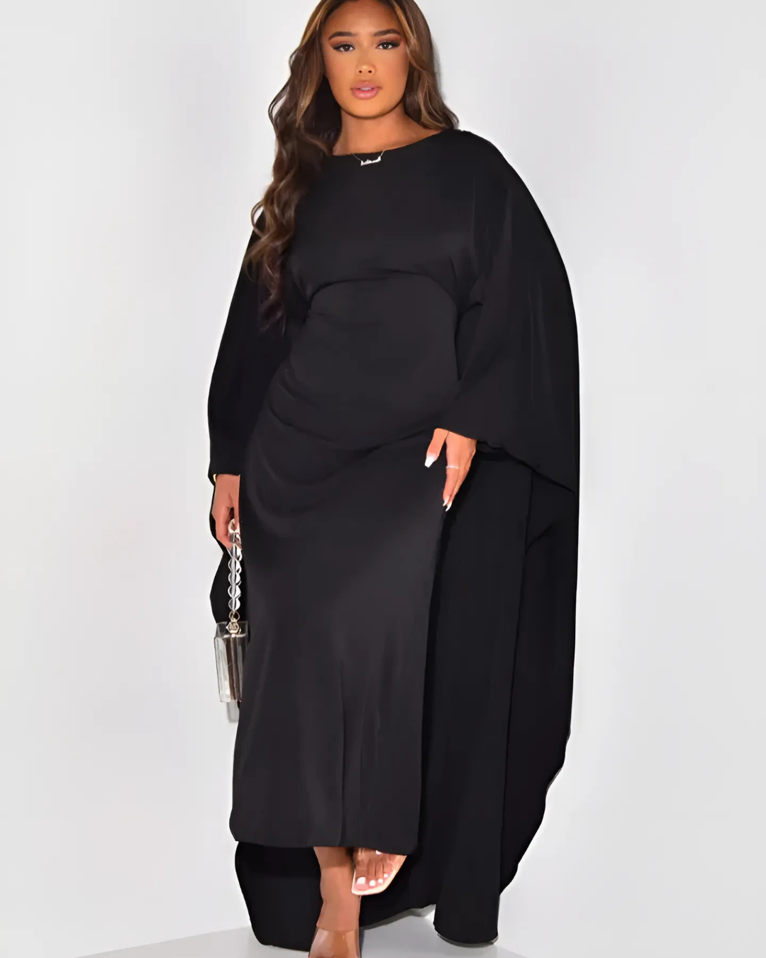 Denne lange kjolen legemliggjør nåde og femininitet med en flytende silhuett og nøye detaljer. Den klassiske runde halsen og de draperte ermene tilfører en touch av raffinement med mykhet. Perfekt for seremonier, formelle middager eller elegante kvelder.