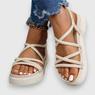 Disse flate sandalene tilbyr en perfekt balanse mellom letthet og støtte. Deres elastiske stropp sikrer en enkel tilpasning, mens de kryssede båndene gir et elegant preg til antrekket ditt. Perfekte for spaserturer, sommerutflukter eller avslappende dager.